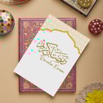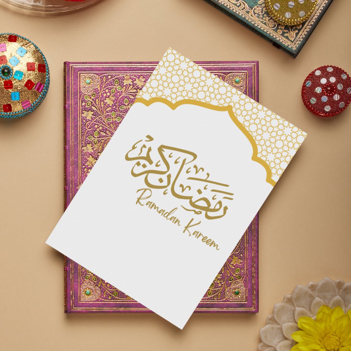 Wish your loved ones a blessed month with this Ramadan Kareem digital greeting card. This 4x6 card features elegant geometric shapes paired with "Ramadan Kareem" in Arabic script with the English wording place below. Include with gifts or food parcels, frame as a simple Ramadan home decor. Share heartfelt wishes in a personal way.